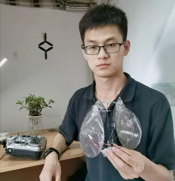 孟雪广副教授。以自然界中游动的水母为模仿对象,他们设计了能在空气中扑动飞行的仿水母扑翼飞行器。利用数值模拟的方法选取了气动效率更高的扑翼运动参数;利用非线性多元函数目标规划方法优化了机构尺寸,改善了扑翼运动的对称性。综合数值模拟和机构优化的结果,完成了仿水母扑翼飞行器的三维建模和重量不足4克的样机制作,并进行了升力测量试验和样机试飞,相关结果有望为设计出性能更好的仿生飞行器提供经验和理论指导。