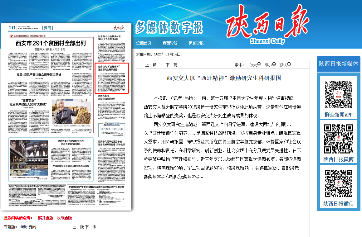 西安交大研究生追随老一辈西迁人“向科学进军、建设大西北”的脚步,以“西迁精神”为滋养,立足国家科技战略前沿,发挥自身专业特点,瞄准国家重大需求,用科研报国。宋思扬及其所在的博士航空宇航党支部,怀揣国家和社会赋予的使命和责任,在科学研究、创新创业、社会实践中充分展现党员先进性,在不断突破中弘扬“西迁精神”,近三年支部成员参研国家重大课题48项、省部级课题22项、横向课题99项、军工项目课题63项、校级课题7项,获得国家级、省部级竞赛奖项20项和校院级奖项27项。