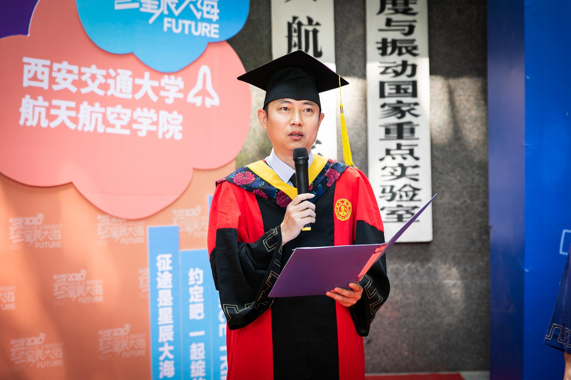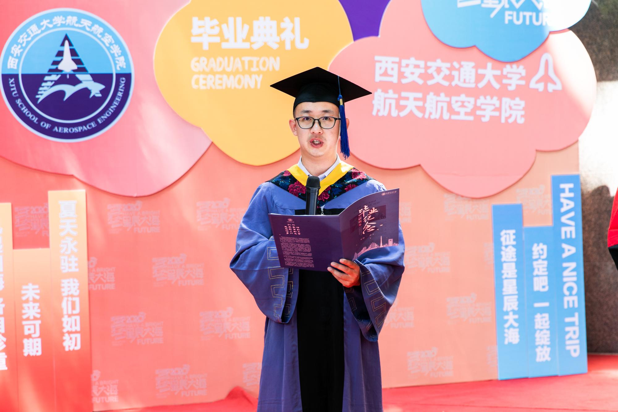 硕7075班周俊辰代表研究生毕业生发言,他表示,感谢交大的培养,让他坚定的继续在祖国最需要的地区从事航天领域科研工作。他表态将以更严谨的学术态度,更高格局的人生规划来践行西迁精神,在今后的工作岗位上踏踏实实做研究,精益求精搞制造,为建设科技强国、空天强国贡献自己的力量,用奋斗书写新时代最美的华章!