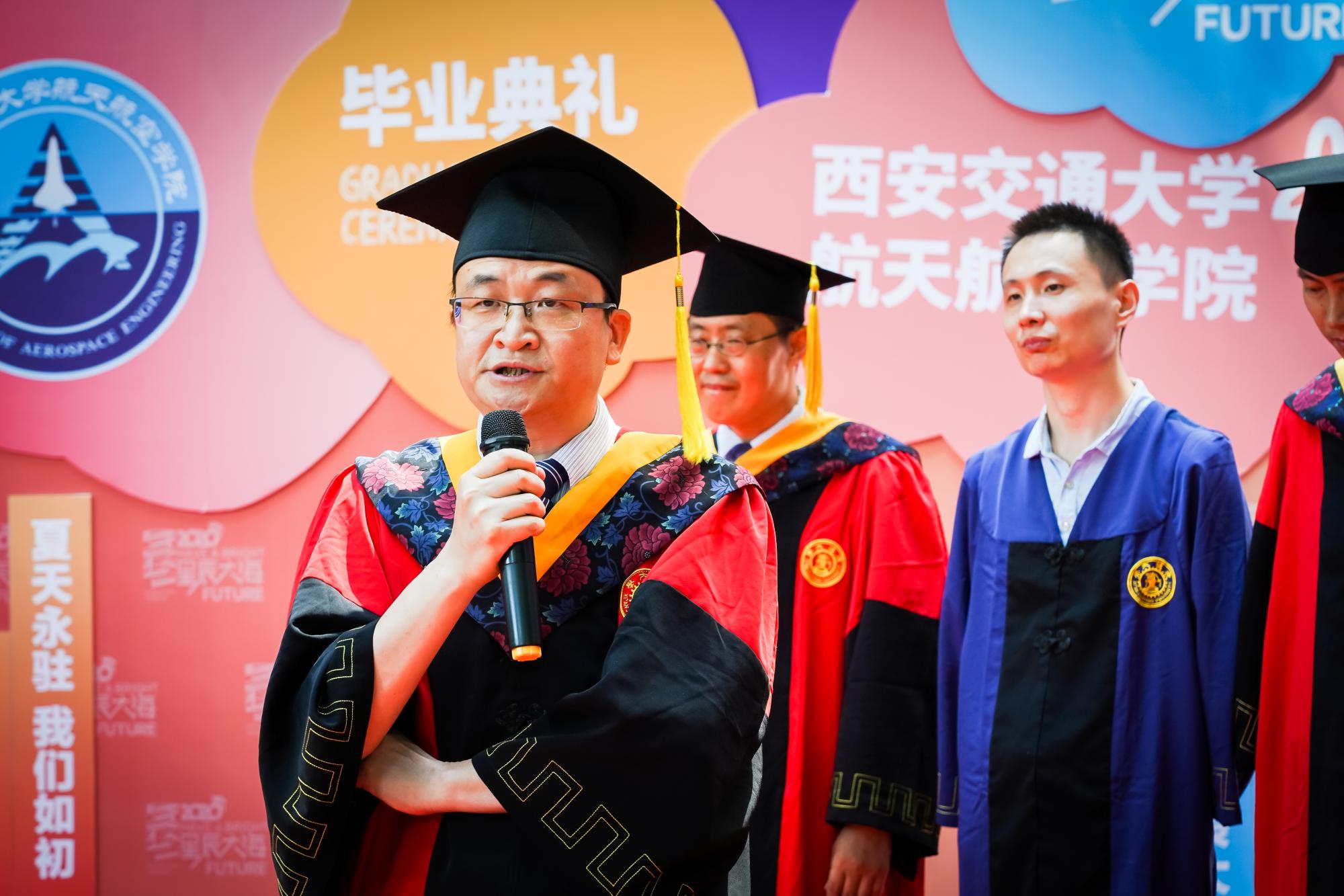 申胜平院长表达了对毕业生完成学位的祝贺,他谈到,“今天,无论你们是学士、硕士、博士,你们都要承担’士不可不弘毅”的使命,在当今纷繁复杂变化无常的世界格局中,保持理性,坚定梦想”。在未来的路上,如何坚守方向,保持定力,申院长用“三个坚信”寄语毕业生。第一是坚定的信仰,申院长援引唐照千教授的事迹,希望毕业生们怀着爱国主义信仰,坚定将西迁精神传扬下去,才能在奋斗路上坚持正确的方向,拼搏奋斗;第二是坚定的信念,申院长讲述了,优秀毕业生秦科科成长经历,希望同学们以优秀校友为榜样,坚定空天报国梦想;第三是坚定的信心,申院长列举校友王建忠艰辛的创业故事,勉励同学们遇见任何困难都不要失去信心。