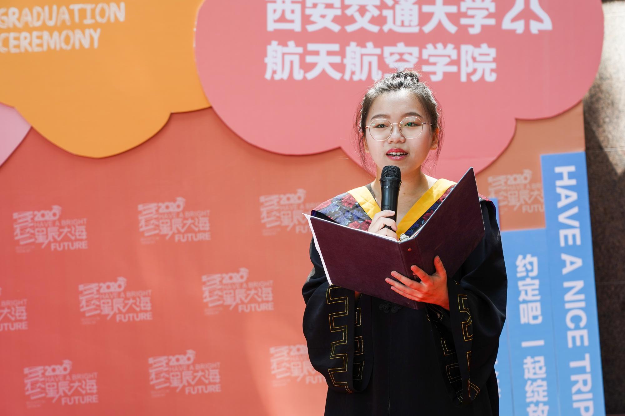 力学62班党若淇代表本科生毕业生发言,她谈到,“回顾大学生活,我们都用自己最好的方式走过了最美好的青春岁月,我们也都有美好的未来”“交大永远都是我们的第二故乡,是我们前进目标的灯塔,是我们心灵的归属地。愿交大、航天学院蓬勃发展、再书华章!”