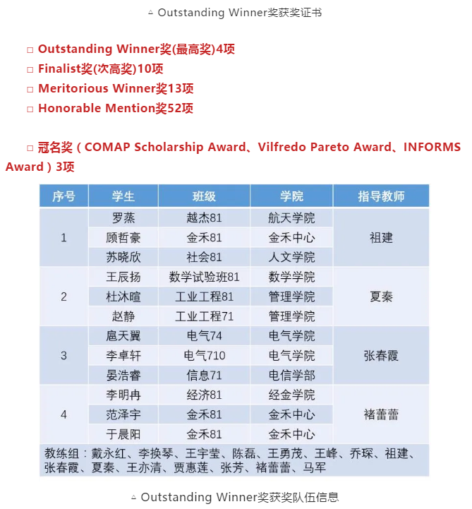 等众多高校在内的20948支队伍(MCM 13749支、ICM 7199支)参加,共评出Outstanding Winners奖37项(获奖率约0.18%),冠名奖16项(获奖率约0.07%)。
