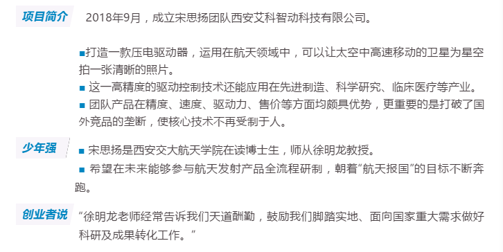 随着生活不断智能化,许多身边的东西都动了起来,而想要做到精准的控制移动,都少不了一个精准的驱动器。宋思扬团队打造了一款压电驱动器,运用在航天领域中,可以让太空中高速移动的卫星为星空拍一张清晰的照片。除了航天领域,这一高精度的驱动控制技术还能应用在先进制造、科学研究、临床医疗等产业。他们团队的产品在精度、速度、驱动力、售价等方面均颇具优势,更重要的是打破了国外竞品的垄断,使核心技术不再受制于人。