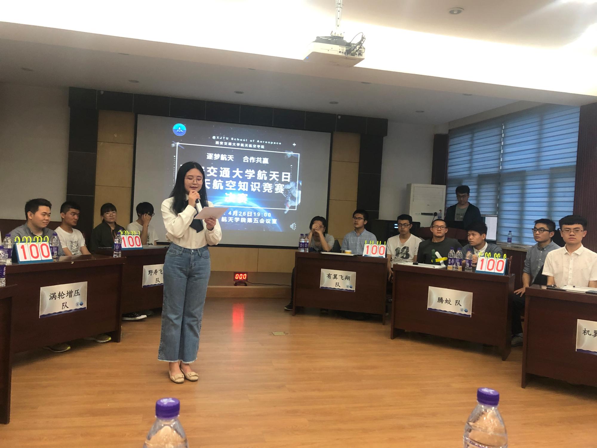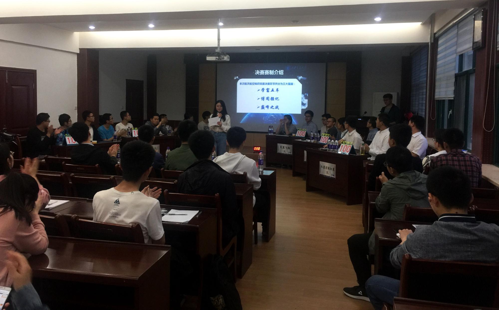 团工委书记李昱静三位嘉宾应邀到场。两位往届全国大学生航空航天知识竞赛总冠军得主担任仲裁。