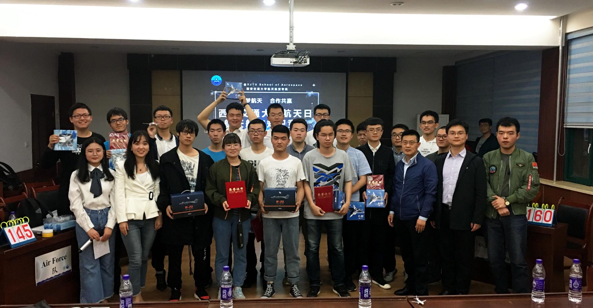 经过三轮激烈角逐,最终,“野兽飞行”队摘得本次知识竞赛一等奖,“有翼飞翔”队、“机翼前缘切菜”队获得二等奖,三等奖则花落“腾蛟”队、“涡轮增压”队、“Air Force”队三支队伍。三位嘉宾分别为获奖队伍颁发证书和奖品并与队员合影。之后,全体参赛人员与嘉宾一同上台,合影留念,本次知识竞赛圆满落幕。