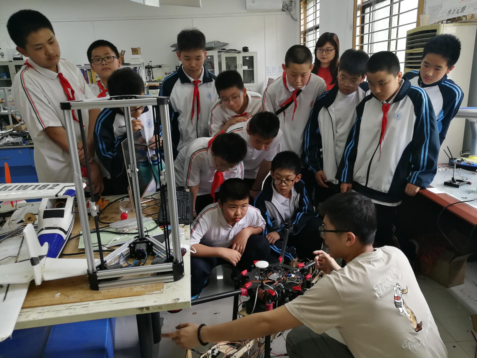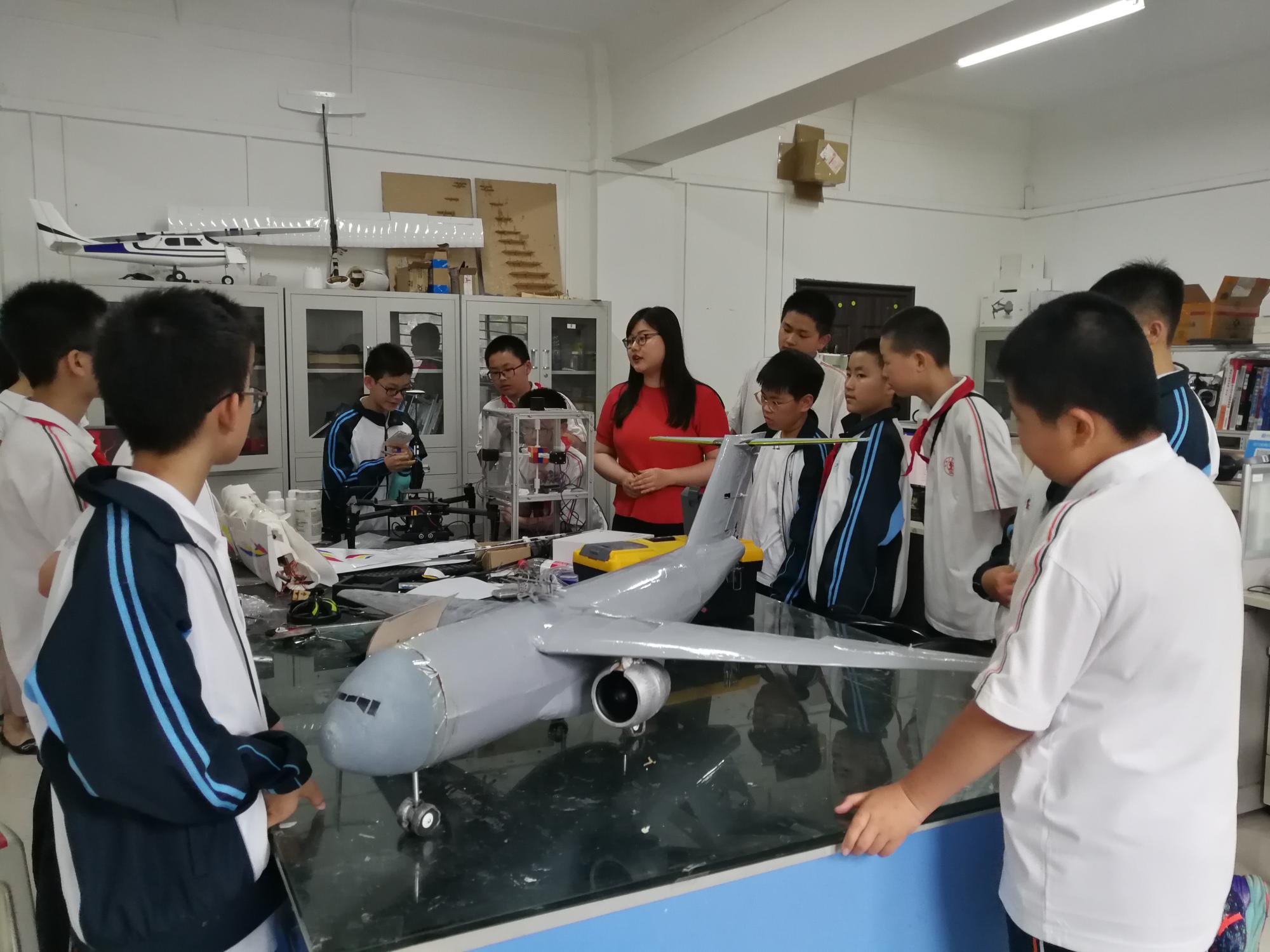 在创新类学生社团—智能飞行器俱乐部参观时,俱乐部骨干成员为中学生们准备了知识问答及手工制作小飞机的活动。虽然这些中学生年龄很小,但是却对智能飞行器有着浓厚的兴趣和知识储备,参观结束仍然流连忘返,迟迟不肯离开,拉着俱乐部成员请教了很多问题,大家都被他们的热情和求知精神而感动。