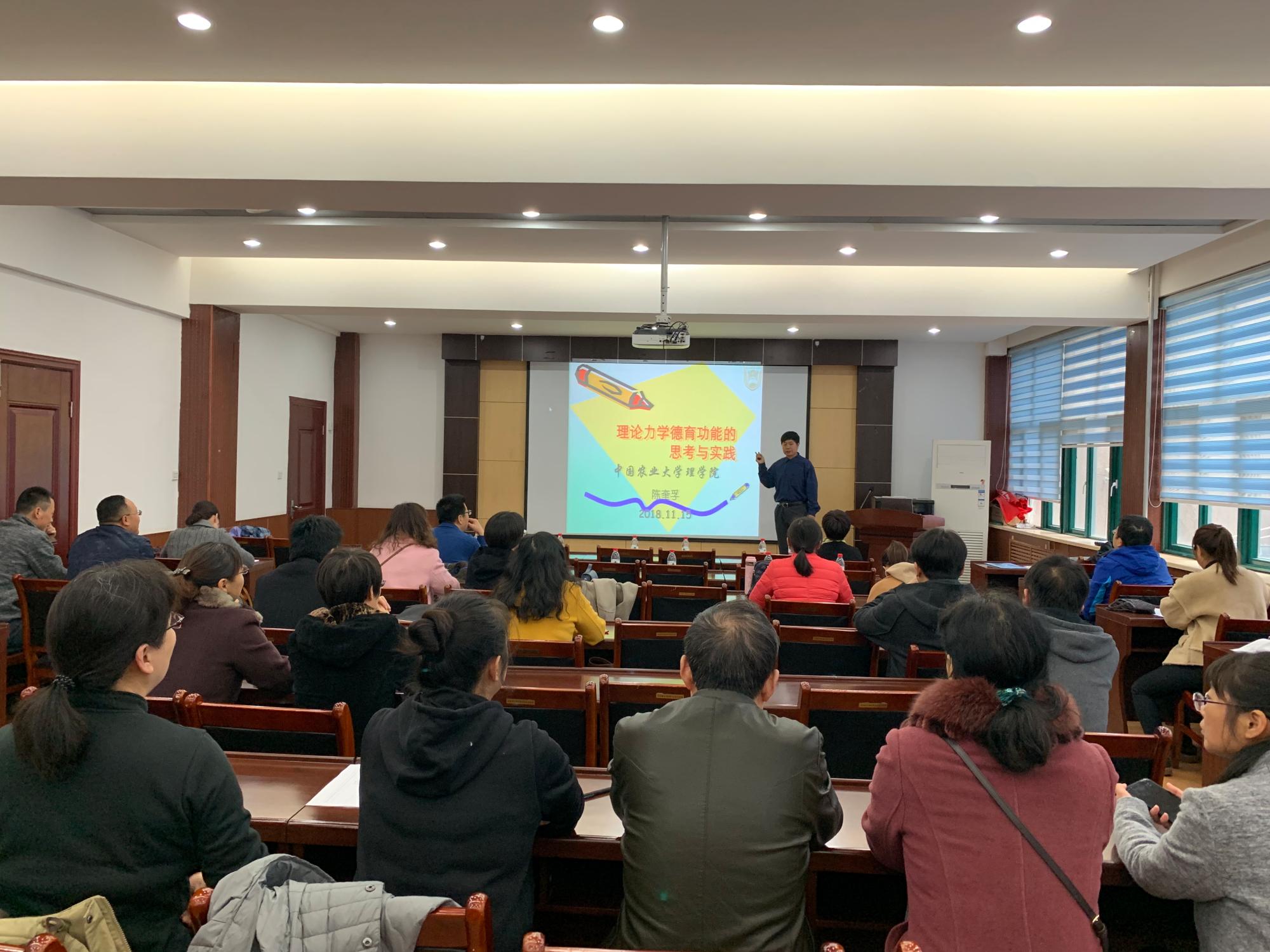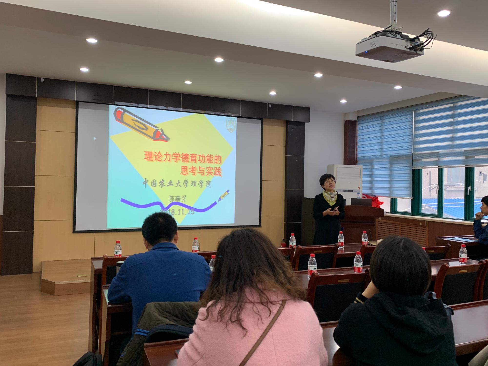 首先陈教授介绍了对课程思政的理解以及自己的感触:教育的目的就是要服从于人类可持续存在的任务,如何在教学中使学生看的远一些,广一些,深一些,是课程思政的目的。其次陈教授分享了自己教学中融入专业课思政功能的三种方式:课堂教学、有德育元素的专业课辅导书和个人公众号。并列举大量具体实例,展示课堂教学融入德育元素的具体操作,演示如何将人生哲理潜入专业课程,启迪和引导学生。随后与会老师与陈教授就课程思政的理念和具体实施方法进行了交流与讨论。