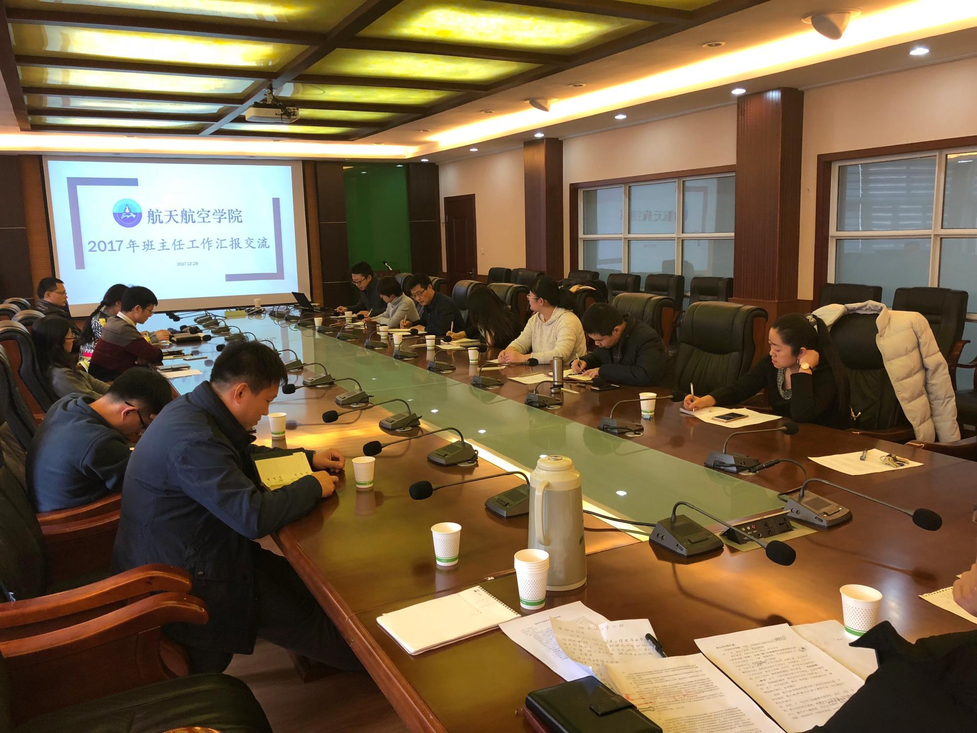 2017年12月,在航天学院第三会议室召开了本科生班主任年度工作汇报交流工作会,出席交流会的有航天学院副院长吴莹教授,文治书院院务副主任纪婷,仲英书院院务副主任陶磊,崇实书院院务副主任张丹,彭康书院院务副主任王琦和全院所有本科生班主任,会议由航天学院党委副书记陈永华主持。