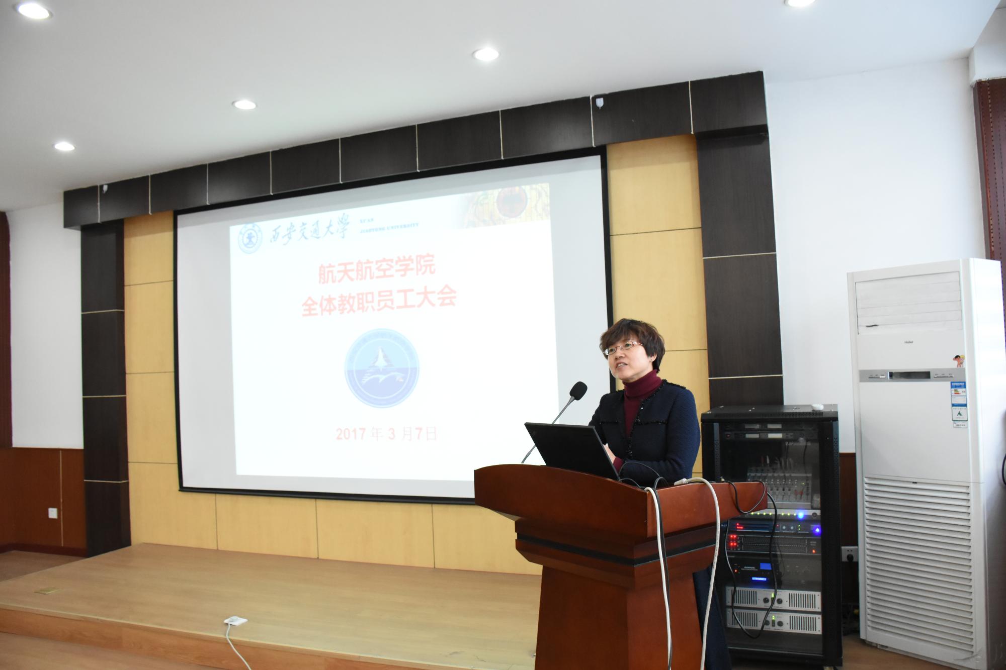 随后,航天学院副院长吴莹教授向与会老师们传达了学校教学工作会议精神,对2017年学校人才培养的重点工作进行了解析,对“问题倒逼、改革推进、重心下移、提质增效”的指导思路和做实本科生院,试点大类招生,建立“本研贯通”的培养体系,加强钱学森学院建设,出台系列绩效分配改革办法等各方面的具体工作任务进行了传达。学校教学工作会议精神传达完毕以后,吴院长又结合航天学院教学工作实际情况,对学科评估工作、航天航空菁英班建设、专业核心课程设置、教改项目申报等具体工作进行了部署。