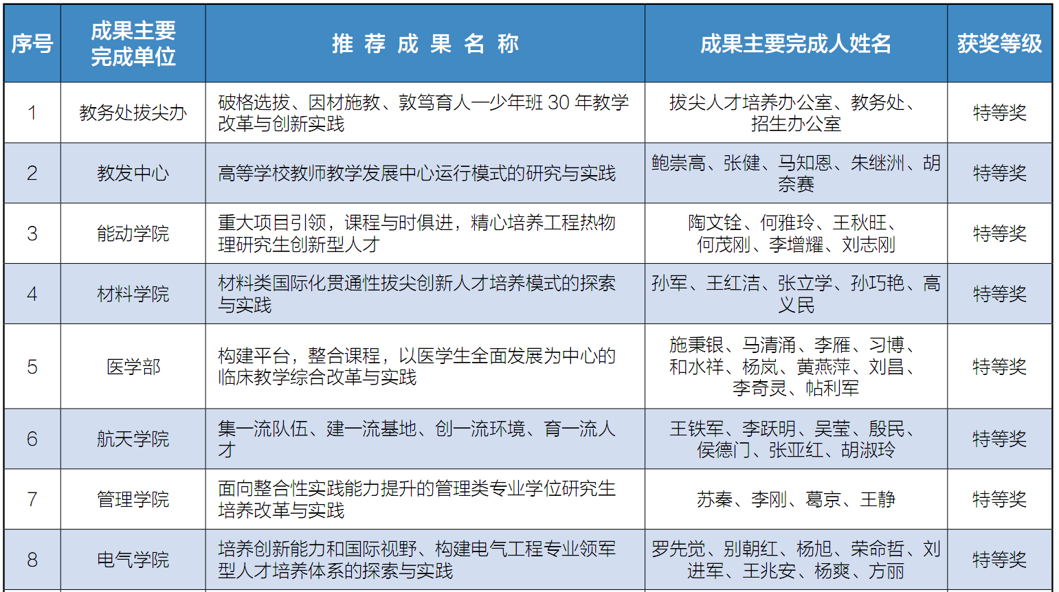 其中,航天学院成果《集一流队伍、建一流基地、创一流环境,改革力学教学体系、培养一流力学人才》荣获陕西省2015年高等教育教学成果奖特等奖。该成果主要完成人为:王铁军、李跃明、吴莹、殷民、侯德门、张亚红、胡淑玲、陈玲莉、陈振茂、赵挺。