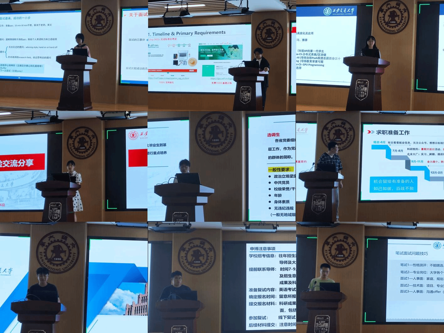 本次分享会主要分为出国留学、国内就业、国内升学三个部分。分别邀请贾烨彤等九位应届毕业生交流分享。贾烨彤、曾梁松、严寒雪玉选择出国深造的三位同学从准备材料、时间节点、如何套瓷、院校选择等方面做了细致的介绍,帮助学弟学妹在之后的留学申请中及时避雷。其中,严寒雪玉师姐还讲述了自己如何跨专业申请留学的经历。胡娜、向雨嫣分享了考公的经验,从学习准备、考试准备、面试准备、心态准备四个方面介绍了报考公务员的注意事项。王志国、余波、黄威分别分享了研究院所、国企、外企相关经历。王志国强调,就业选择一定要结合自己的兴趣爱好、地区倾向、专业背景等考虑因素,寻找这些因素之间的平衡点,选择自己心仪的就业形式,多投简历,多面试,多积累经验,相信自己最终一定会拿到心仪的offer。余波则提醒大家,要学会收集信息,尤其是半透明的就业信息,需要通过实习去拓展之间的见识,这样会增加自己拿到满意offer的机会。最后,选择继续在国内升学的马晓刚进行他的申博经验分享。他告诉同学们,一定得提前做好准备工作,联系好导师,确定好名额,不能等到临近毕业时才手忙脚乱。其次,申请读博士一定要写好个人规划,导师推荐信等基本信息,还要尽量多发文章,以取得更好的结果。