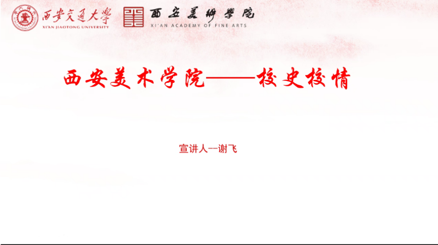 随后,西安美术学院谢飞同学宣讲校史校情。他表示,西安美术学院立足卓绝的延安精神和厚重的历史文化传统,传承红色基因,形成了独具特色的艺术教育理念,为国家的建设发展培养了大批优秀艺术人才,创作了许多在中国当代美术史上具有深远影响的作品,为繁荣社会主义艺术事业做出了重要贡献。