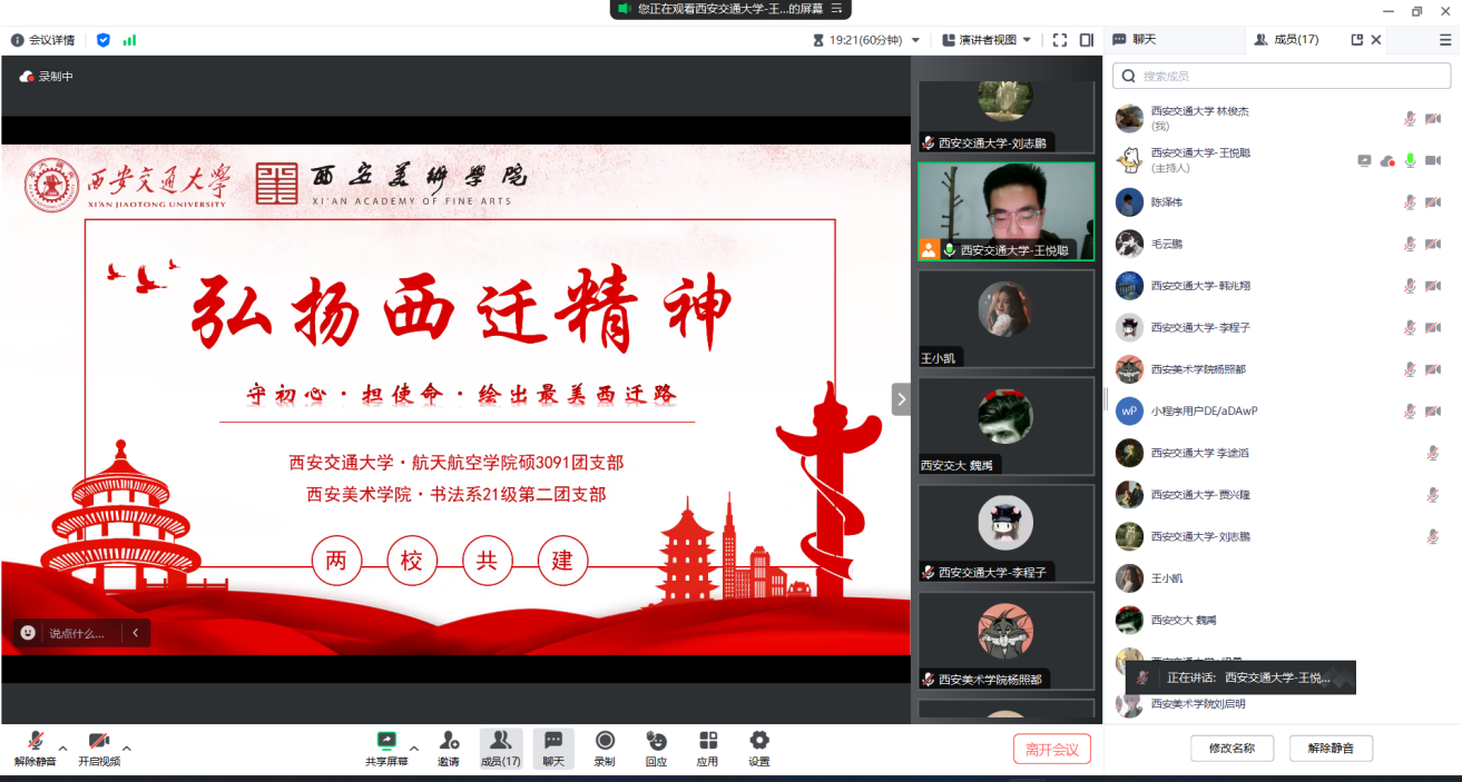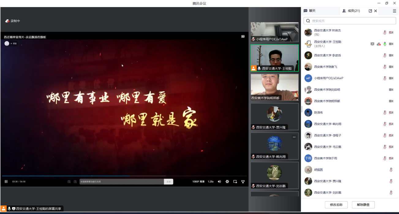 与会成员共同观看西迁精神宣传片《永远飘扬的旗帜》。航天学院王悦聪同学表示,作为青年一代,要将西迁精神落实在爱国奋斗的实际行动中去,坚守正确的政治方向,秉持心系家国、敢为人先的价值追求。航天学院贾兴隆同学谈到,学好西迁精神是我们成为交大人的第一课,要继承前辈们的优良品格,在祖国最需要的领域刻苦钻研,勤奋工作,努力创造无愧于新时代的光辉业绩。