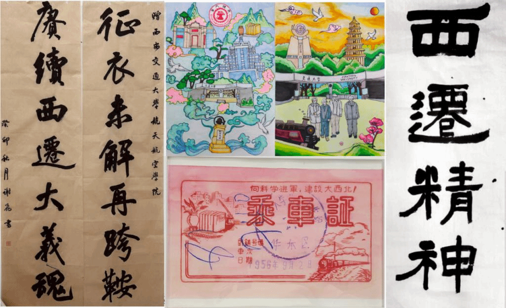 西安美术学院书法系的同学们手绘出西迁乘车证,缅怀老前辈们“打起背包就出发”的家国情怀。谢飞同学则写下“西迁精神”和“赓续西迁大义魂,征衣未解再跨鞍”,笔力雄健,遒劲有力,颂扬交大西迁的光辉历程。