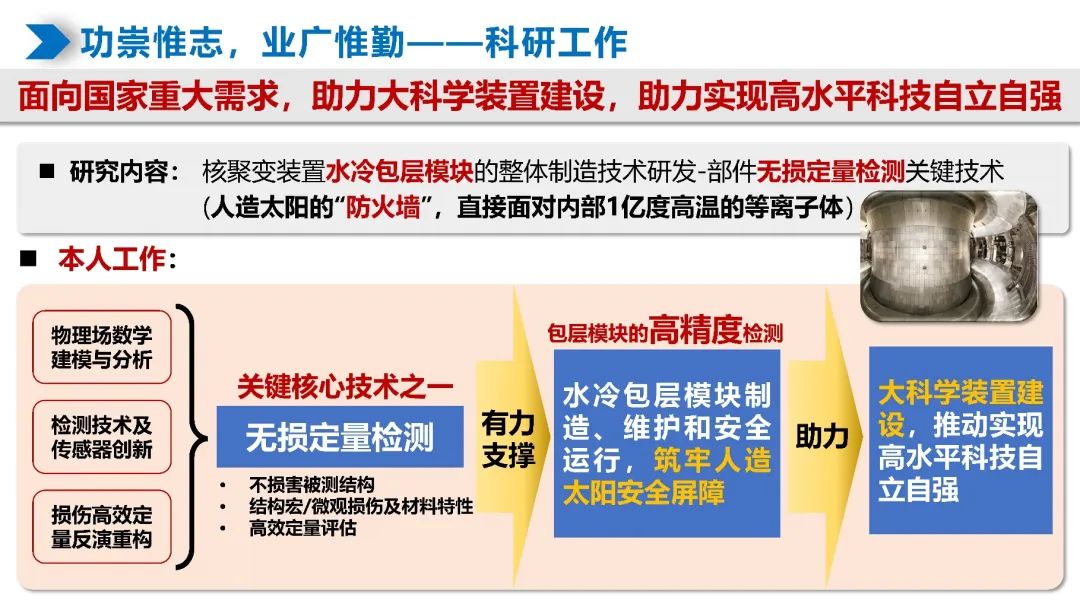 作为一名力学专业的学子,刘正帅致力于面向国家重大需求开展科学研究。通过参与相关研究课题,围绕核聚变反应堆的制造、维护和安全运行研发先进的无损定量检测关键技术,保障大科学装置的安全平稳运行。