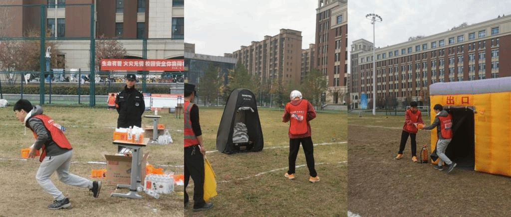 比赛共有四个项目:水带接力、烟雾灭火、障碍救援和危急时刻。在水带接力项目中张洋、易平、李宇辰、张英豪配合默契,快速完成水带的甩出和连接,穿戴好消防服,完成“灭火”任务。在烟雾灭火项目中岳明楷和林俊杰迅速行动,通过烟雾逃生帐篷后穿戴防烟面罩,扑灭模拟火源。在障碍救援项目中,白金文、赵宇鑫和胡瑾桐齐心协力,携带担架克服障碍,迅速救出“火场被困人员”。在危急时刻项目中,李轩、许琦鹏和李成功通过障碍赛道,并将水桶灌满。