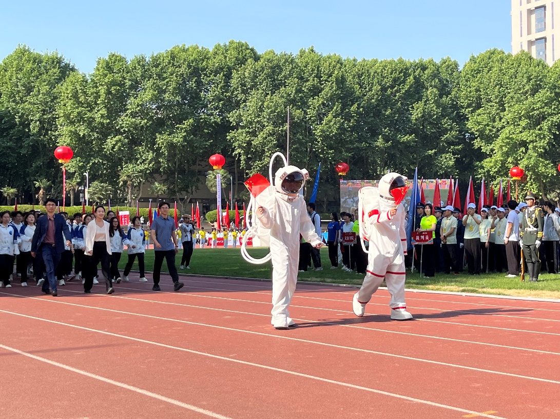 运动会开幕式上,在党委副书记李昱静、院长助理张虎、研究生辅导员李宇辰的带领下,航天学院方阵走过主席台,队形整齐、口号响亮,航天员人偶彰显航天特色。