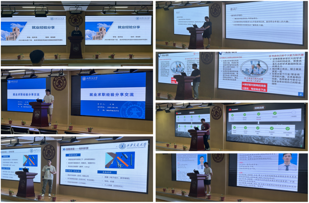 分享会覆盖求职就业、国内升学和出国深造三个方面的内容。毕业生们结合自身经历,倾情分享经验。陈宇浩、王维分享了如何选择适合的科研院所就业,并指出了针对研究所的求职注意事项。王方宇、吴云凯、杨秋锋则分享了重点企业的面试准备技巧与实战经验。岳修贤详细介绍了高校申博的流程与细节要求。朱相辰则从申请海外高校的材料准备与经验技巧两个方面展开分享。