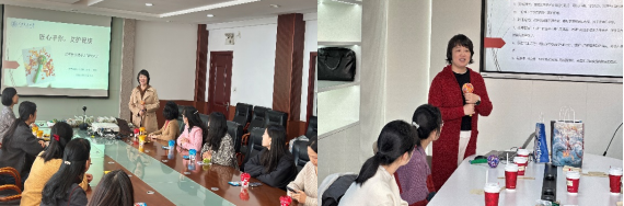 活动伊始,黄莺讲解了艾草的药用价值(温经散寒、祛湿通络)及黄帝内经中相关养生知识,并现场示范利用艾草锤进行“拍八虚”的养生动作,引发大家的浓厚兴趣。随后,通过拆解养生锤的结构及制作步骤现场教学,老师们打开事先准备好的材料包边学边做,在揉捏、捶打、包裹、缠绕中体验“力道与耐心”的非遗匠心,体验从工具到情感的温暖传递。