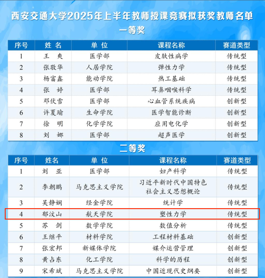 郁汶山教授凭借在传统型赛道上对《塑性力学》课程的精彩讲授,以扎实教学功底与创新教学理念,经初赛随堂听课、复赛材料评审及现场评比等环节,从145位参赛教师中脱颖而出,荣获二等奖,彰显学院教师的教学风采。