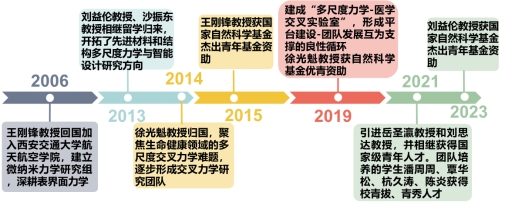 ,发展了微纳米力学研究方向,深耕表界面力学,并于2015年获国家杰出青年基金资助。2013年,刘益伦教授、沙振东教授相继留学归来,开拓了先进材料和结构多尺度力学与智能设计研究方向。2014年,徐光魁教授从德国马普所留学归国,聚焦生命健康领域的多尺度交叉力学难题,开展一系列交叉力学与生物力学研究。团队成员以学术兴趣为纽带,通过有组织科研和项目牵引,逐步形成了交叉力学研究团队。2019年在中国西部创新港建立“多尺度力学-医学交叉实验室”,强化平台支撑作用,强调个人兴趣和科研公关相统一,形成了“有组织科研+自由探索”相结合的科研生态。得益于平台和团队支撑,团队成员进入发展快车道,刘益伦教授2018年获万人计划青年拔尖人才,2023年获基金委杰出青年基金资助,徐光魁教授2021年获基金委优秀青年基金资助,沙振东教授连续五年入选世界排名前2%科学家排行榜(2019-2023)。秉承“引育并重”的建设理念,形成了平台建设-团队发展互为支撑的良性循环,2021年和2022年分别引进岳圣瀛教授和刘思达教授,相继获得国家级青年人才。团队培养的学生潘周周、覃华松、陈炎获得校青拔、青秀人才称号。交叉力学研究团队以“精神传承为根基、交叉平台为枢纽、前沿创新为引擎”,逐步形成了学术传承有序、学科背景多元、创新思维活跃的新一代研究生导师队伍。