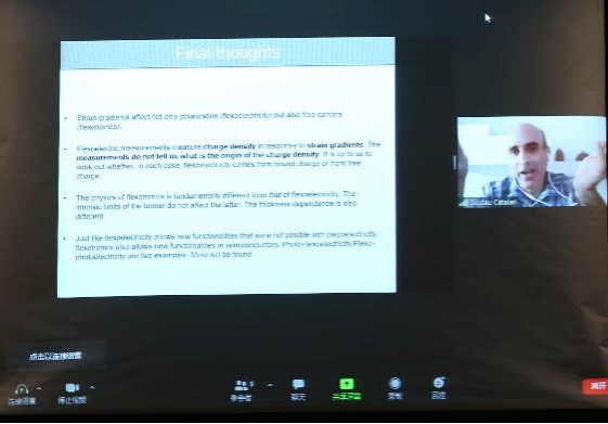 本次会议的10余次邀请报告,内容涉及了挠曲电领域中力、电、光、热等多个研究方向,参会专家均为国内外挠曲电相关研究领域的权威专家。其中美国休斯敦大学的Pradeep Sharma教授对挠曲电研究的理论及应用进行了介绍,尤其是针对软物质当中的挠曲电效应的力学模型和理论分析;巴塞罗那纳米科学与技术研究所的Catalan教授展示了挠曲电和挠曲电电子学的相关工作;南方科技大学的李江宇教授介绍了用AFM对挠曲电效应进行表征的一系列工作;香港理工大学的戴吉岩教授讨论了钙钛矿氧化物及其异质结构中的光电挠曲电效应和界面挠曲电效应;同济大学的庄晓莹教授介绍了纳米结构挠曲电效应的多尺度模拟和优化;浙江大学的王杰教授展示了应变和应变梯度对铁电材料拓扑畴结构的影响。