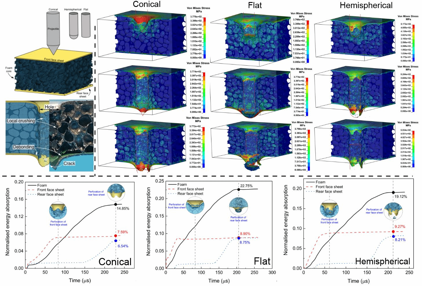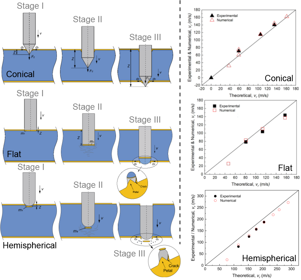 近日,soul 秦庆华教授和新加坡国立大学Poh L.H. 教授针对三明治金属泡沫夹芯复合防护的弹道极限问题,系统地开展了三明治夹芯复合防护结构的高速冲击破坏实验(图1),获得了平头、球头及锥头弹体的入射速度、剩余速度以及夹芯复合防护结构被贯穿后的破坏形貌等重要实验数据(图2);提出了泡沫芯材层细观结构重构的高精度新算法,建立了夹芯复合结构跨尺度弹道冲击数值模型(图3);以实验结果导引,提出了三明治夹芯复合防护结构刚性弹体侵彻动力学新理论模型(图4)。研究获得了高速弹体冲击下夹芯复合防护结构的多种新失效模式,揭示了高速弹体侵彻下三明治夹芯复合结构的能量耗散机制,阐明了三明治复合夹芯结构各组成部分的能量分配原理,提出了以复合防护结构抗弹能力为驱动的夹芯复合防护结构质量分布设计策略,回答了在相同面密度条件下如何设计芯材可压缩三明治复合防护结构的迎弹面板和背面板的问题。研究结果表明,较厚的迎弹面设计有利于提高复合防护结构的抗弹性能。