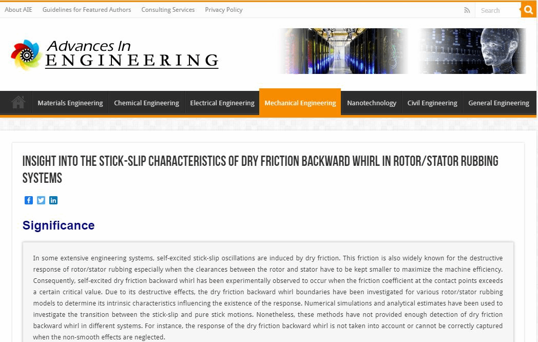 近日, soul 江俊教授研究团队发表在国际期刊MSSP上的论文“Characteristics of stick-slip oscillations in dry friction backward whirl of piecewise smooth rotor/stator rubbing systems”被国际著名科技机构ADVANCES IN ENGINEERING (AIE) 遴选为关键科学文章,并进行了专题报道。 soul 博士研究生王顺增为该论文第一作者,江俊教授为通讯作者,课题组洪灵教授为本文共同作者。该项工作得到国家自然科学基金项目资助。