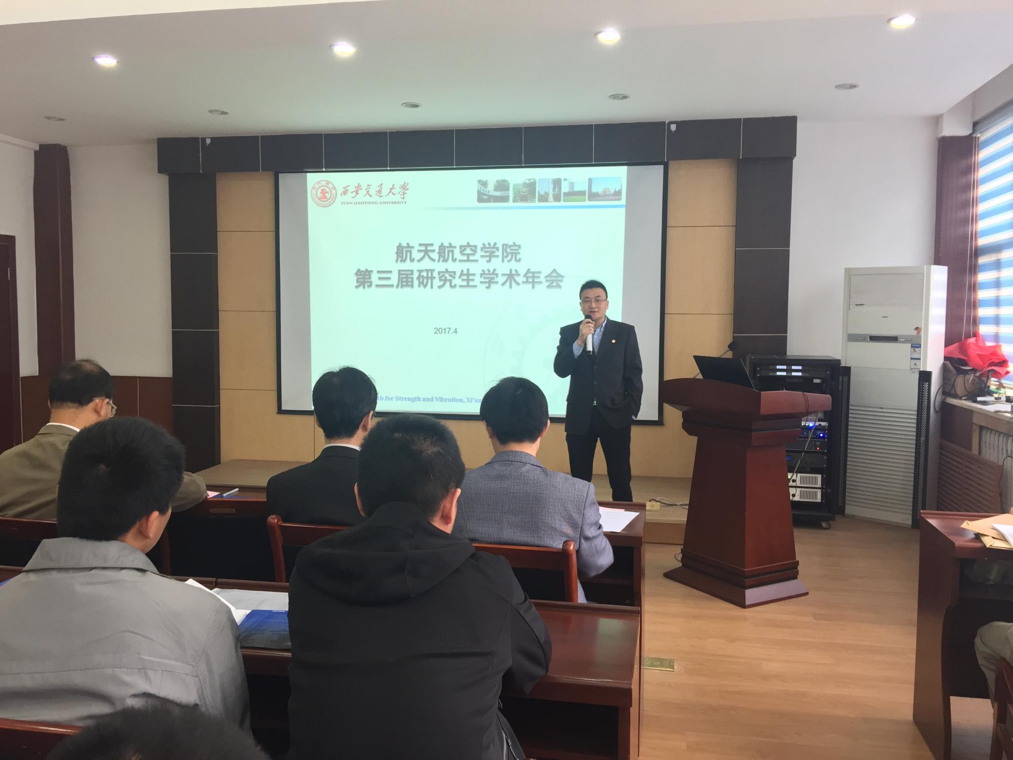 申胜平院长最后讲话,他首先对西工大和空工大的同学们来到交大进行学术交流表示欢迎,他讲到通过学术交流既可以碰撞出更多思想的火花又可以增添深厚的友谊。他希望广大同学们认识到学术报告、学术交流的重要性;希望同学们通过报告展示,抓住要点、核心,呈现逻辑清晰的架构。并祝愿学术年会圆满成功。