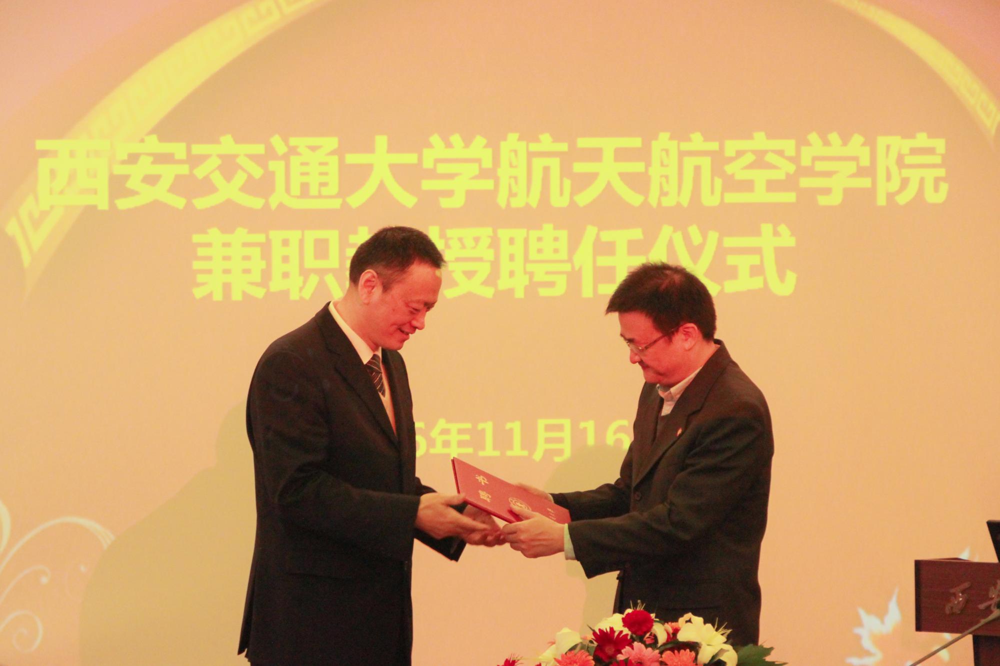 副校长王铁军教授,航天学院院长申胜平教授,副院长李跃明教授、吴莹教授,副书记徐自力教授,以及院长助理、各系主任以及教师与学生代表。聘任仪式由副院长李跃明教授主持。