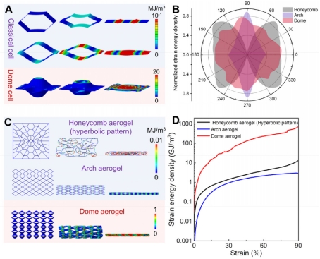 氧化石墨烯具有原子级各向异性及丰富的化学官能团,然而层间相互作用较弱,易发生层间滑移等失效行为,导致高温下出现显著软化现象。同时,传统陶瓷在高温下晶粒易长大,形成粗大晶体结构,进一步加剧其脆性。针对上述问题,我们提出了一种基于二维通道限域发泡的超弹性气凝胶可控构筑方法:以氧化石墨烯薄膜为前驱体,引导金属离子在石墨烯构建的二维限域通道中实现原子级均匀分散,并通过调控热处理过程形成由纳米晶组成的多晶氧化物层状结构。该方法能够有效抑制粗大晶粒团聚体的形成,显著增强气凝胶胞壁的热稳定性与弹性(图1)。进一步通过多尺度建模,构建了蜂窝、拱形与穹顶结构单胞及多胞模型,并基于考虑微结构特征的有限元分析方法系统评估其压缩-回弹过程中的受力变形与弹性应变能储存特性。结果表明穹顶微结构的非可展曲面几何特性在压缩加载下自发产生高密度且均匀分布的褶皱网络(图2),可有效降低回弹阶段胞壁间的粘附阻力,并通过增强胞壁弯曲变形能力显著提升整体弹性应变能。此外,通过对应变能密度场分布分析,我们发现穹顶结构可避免局部应变集中引发的失效与能量损耗,在极端力-热耦合环境下展现出卓越的结构稳定性,其弹性应变能存储能力较蜂窝与拱形结构提升一个数量级。