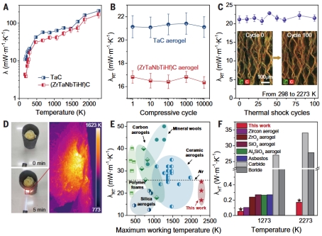 图4.碳化物气凝胶的热绝缘性能表征。(A) TaC与高熵(ZrTaNbTiHf)C气凝胶在173 K至2273 K范围内的热导率变化曲线;(B) TaC与高熵(ZrTaNbTiHf)C气凝胶在室温下经历99%应变压缩循环10,000次后的热导率;(C) TaC气凝胶在2273 K下热冲击条件下,经过100次循环后的热导率,其中插图为TaC气凝胶的微观结构及元素分布图;(D) TaC气凝胶用于高温热防护场景的实物照片及其对应热成像图像;(E)碳化物气凝胶(包括TaC、ZrC与高熵(ZrTaNbTiHf)C)与典型绝热材料的最大工作温度及室温热导率对比图;(F)碳化物气凝胶在1273 K与2273 K下的热导率与已报道陶瓷材料的对比图。