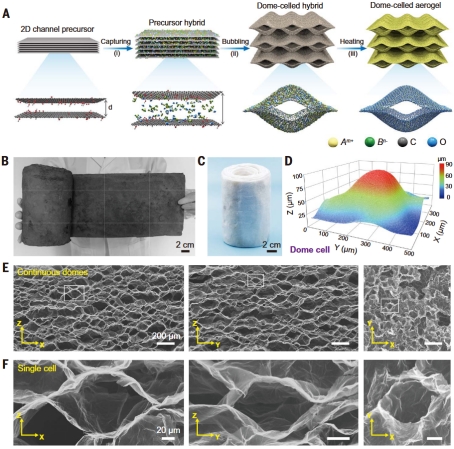 图1.基于石墨烯二维通道限域方法的穹顶微结构气凝胶构筑。(A)气凝胶的制备过程包括三个关键步骤:①通过可调控的氧化石墨烯(GO)限域通道定向捕获金属盐离子;②利用含发泡剂的溶剂诱导鼓泡,构建穹顶微结构;③经热转化处理,在空气中于600 °C加热4小时、氩气中于2000 °C加热2小时,或氢气中于450 °C加热1小时,分别得到氧化物、碳化物与金属气凝胶。(B, C)所制备碳化物气凝胶板材与氧化物气凝胶卷材的实物图像。(D)基于厚度约500 nm的超薄GO膜鼓泡形成的穹顶微结构的三维光学图像。(E, F)穹顶气凝胶在X-Z、Y-Z和X-Y三个方向切片后的扫描电子显微镜(SEM)图像,揭示其各向异性的三维结构特征。