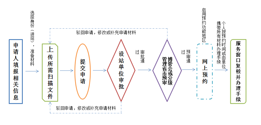 说明:北京地区设站单位人员办理进站、出站手续须进行在线预审和网上预约,(如设站单位采用集中办理方式,申请人只需提交在线预审,无需网上预约及前往现场办理)